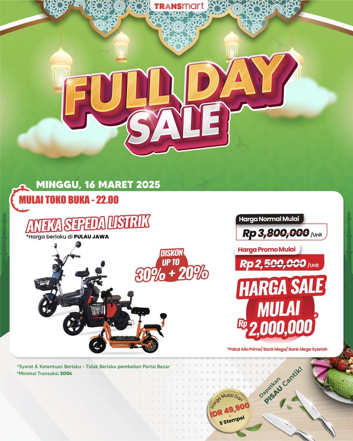 Secara keseluruhan, Transmart Full Day Sale pada 16 Maret 2025 menawarkan kesempatan yang sangat baik untuk berbelanja barang elektronik, khususnya sepeda listrik, dengan harga yang jauh lebih terjangkau. Jangan sampai ketinggalan!